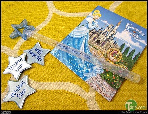 식사하면서 받은 것들. 자리에 앉으면 소원을 빌라고 반짝이는 별 조각을 사람 수대로 주고, 식사 끝날때 쯤 해서는 신데렐라와 찍었던 사진을 인화해서 포토북에 넣어줍니다. 그리고 남자아이라면 장난감 칼을, 여자아이라면 요술 지팡이를 선물로 주지요.